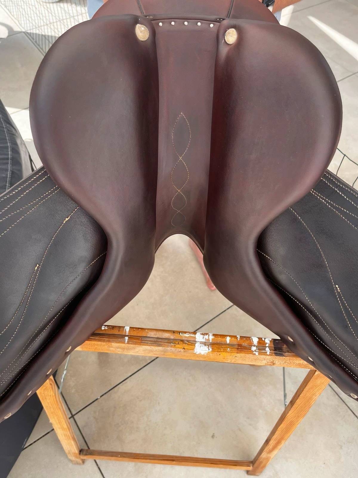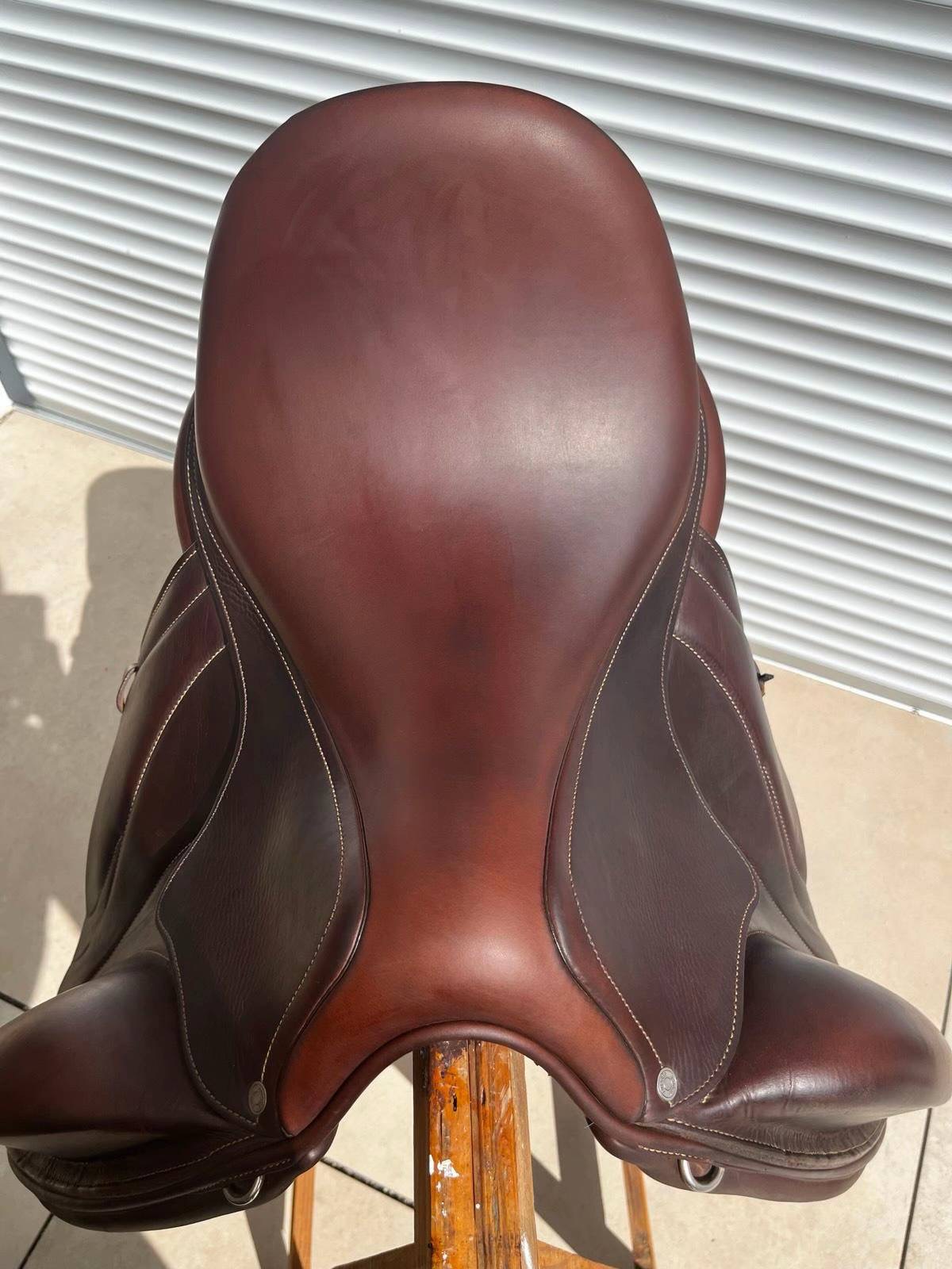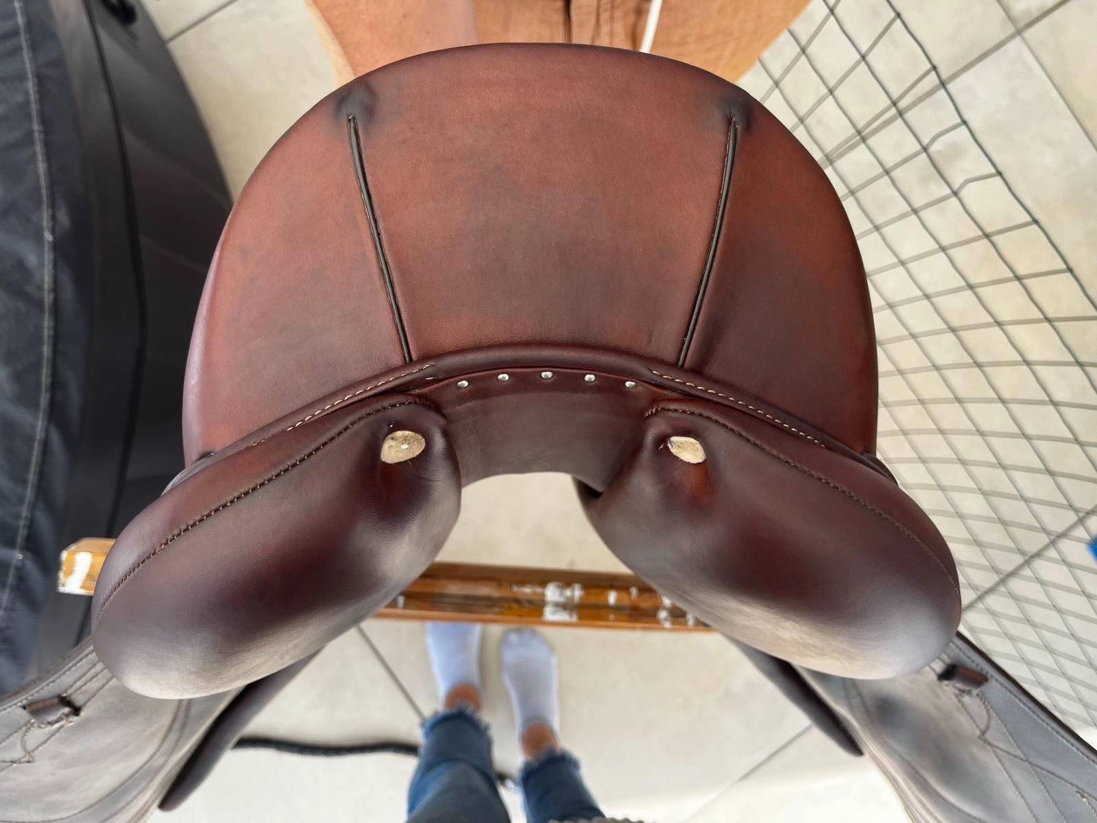 À vendre selle de dressage Antarès, modèle Cadence, en cuir marron, dotée d’un siège de 17 pouces.